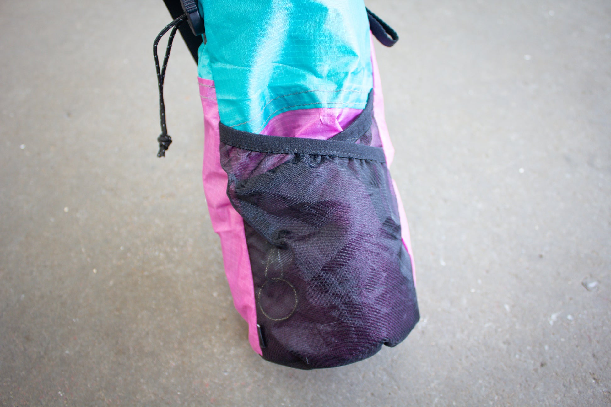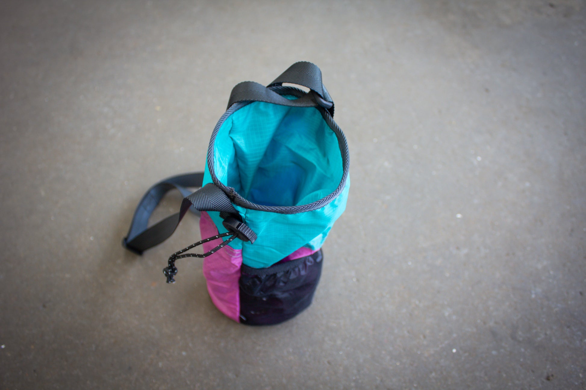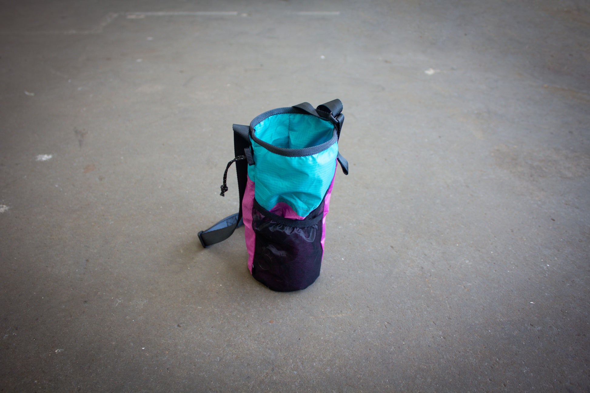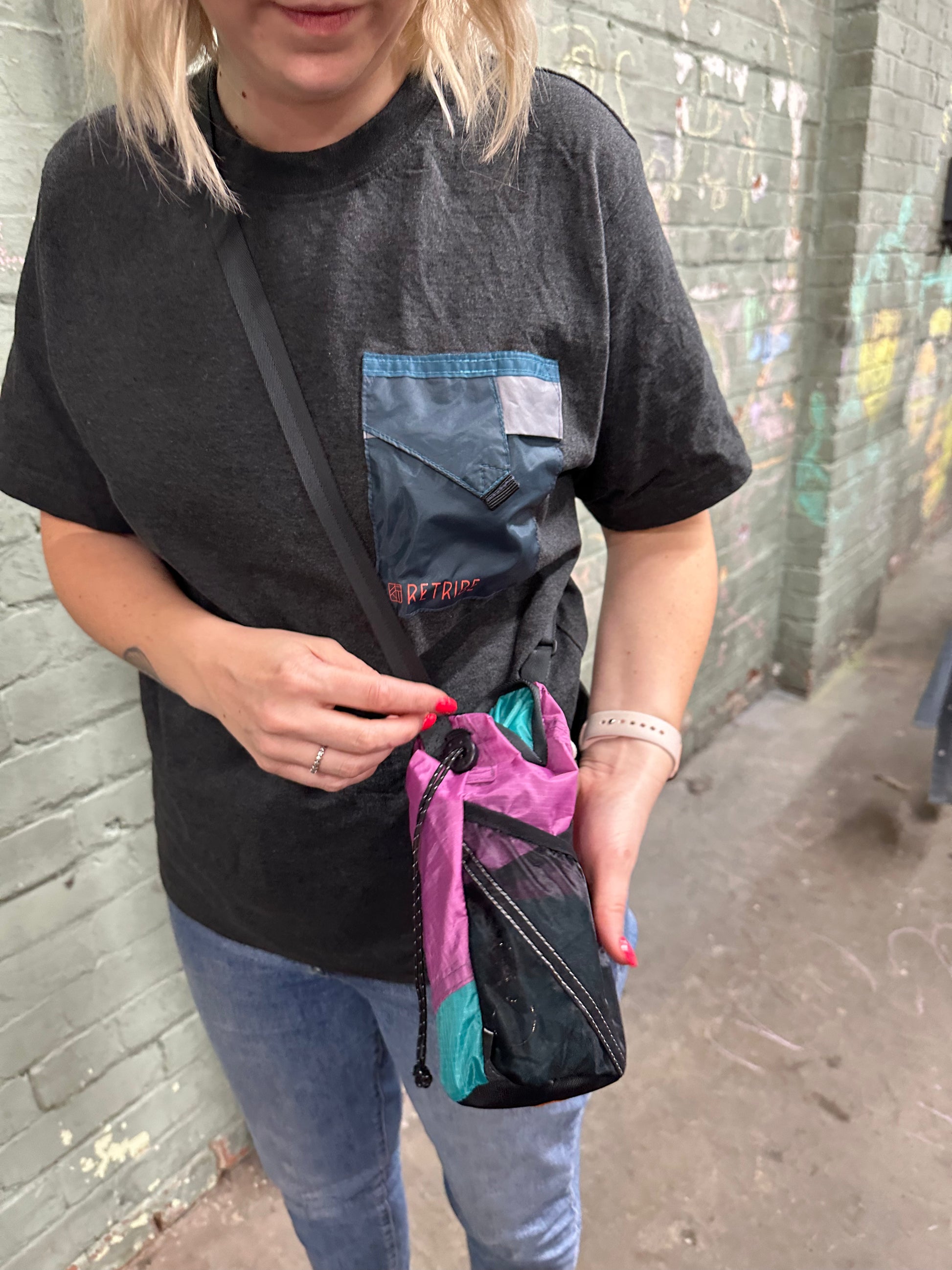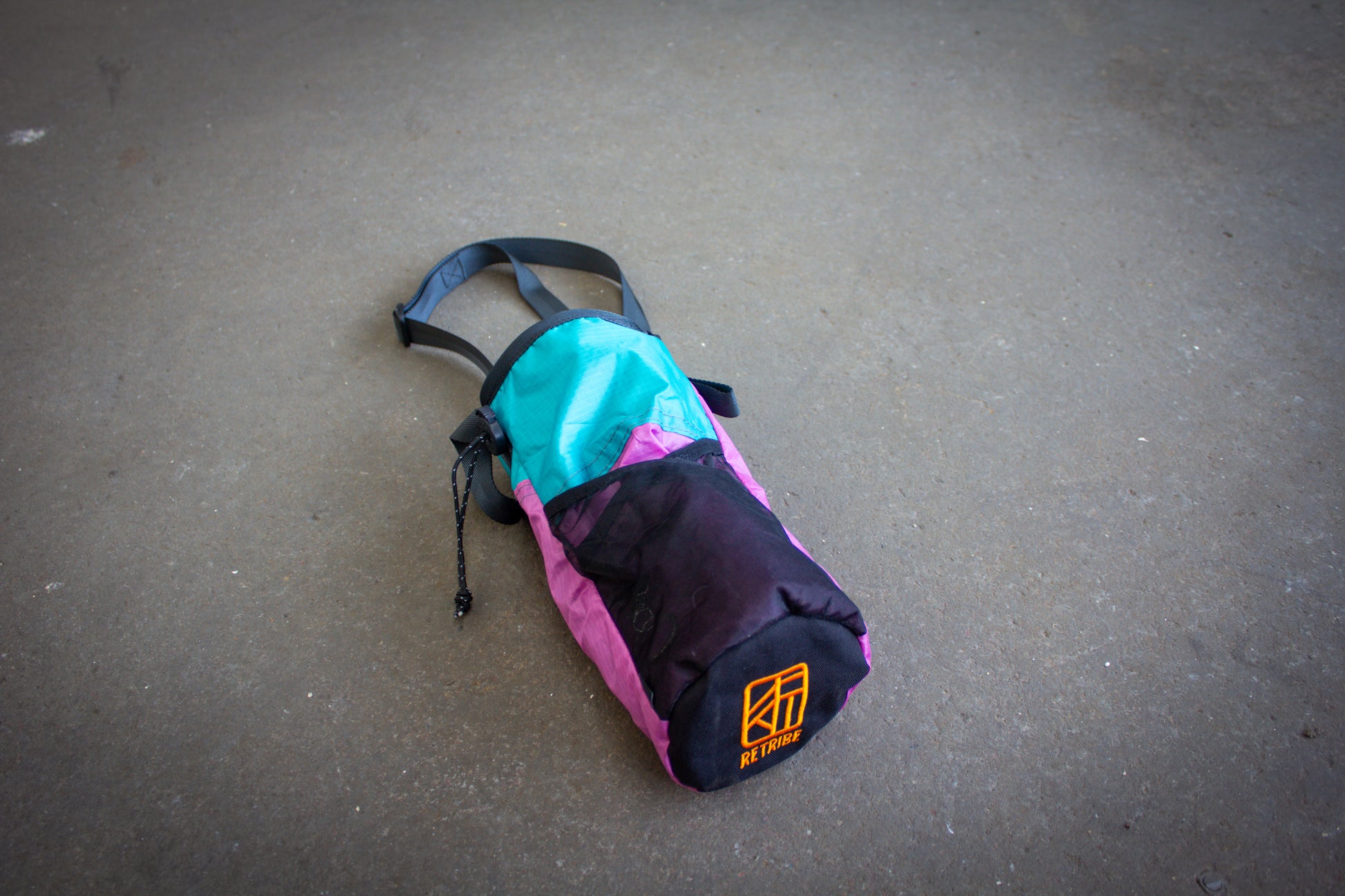 Constructed from 100% recycled materials, the Circular Bottle Carrier features a drawcord bottle holder repurposed from a tent's guy rope with adjustable strap, two mesh pockets formerly utilized as a tents mesh door, and a key chain and accessory loop.