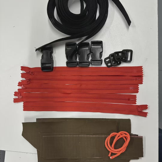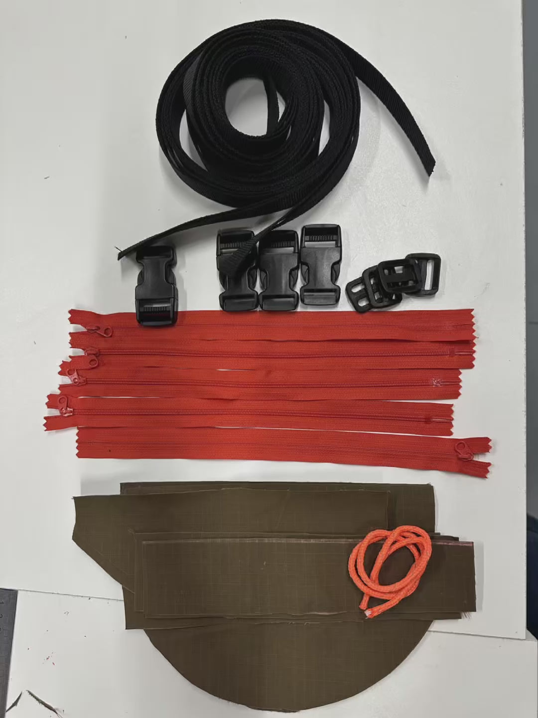 Utilising trims we had salvaged from tents and clothing this features a zip top and clip on strap than can be worn as a sling bag or as a hip bag. The strap can also be adjustable.