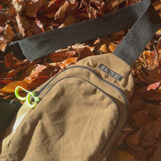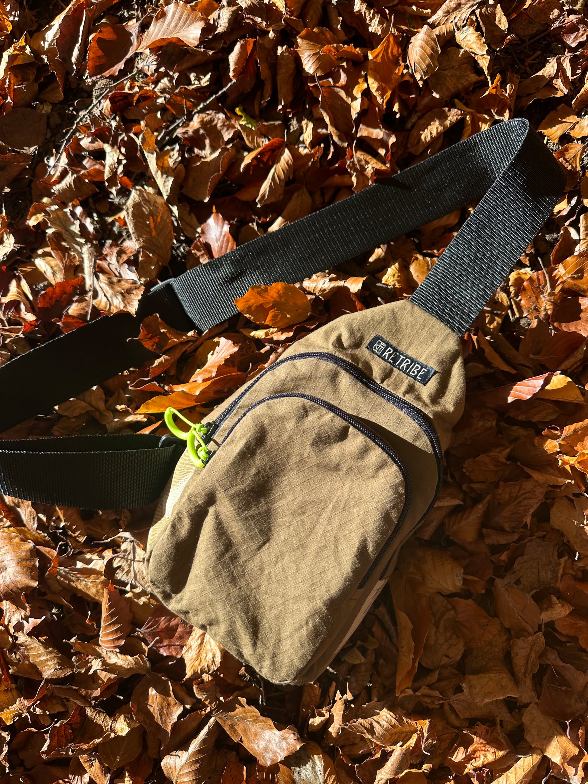 Our Upcycled Deadsling bag is made from a lightly waxed ripstop cotton on the outer. Which we sourced from one of our deadstock suppliers. The back panel is a sturdy but soft foam mesh. The sides are panelled with salvaged tent material and a camouflage canvas material which is also water resistant.