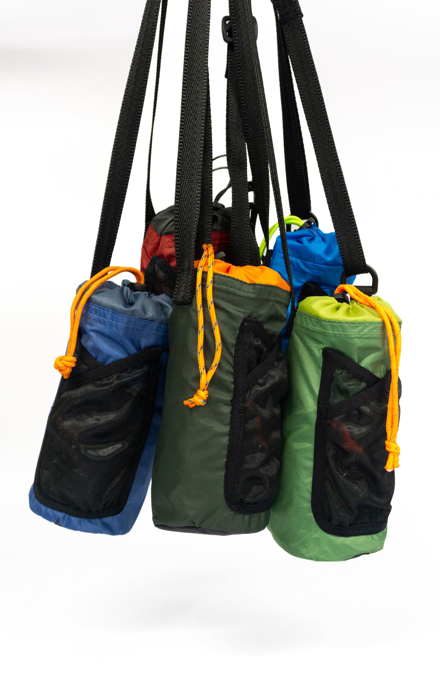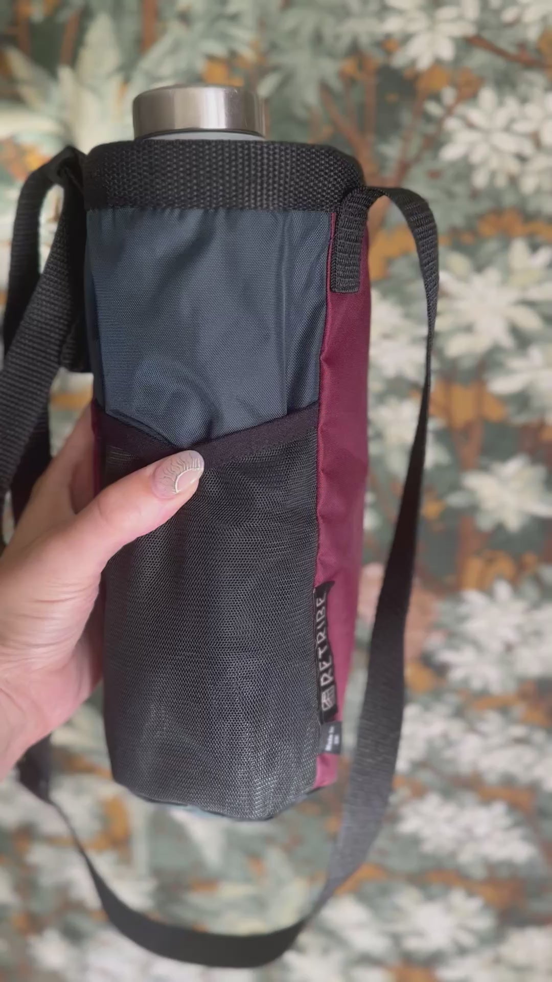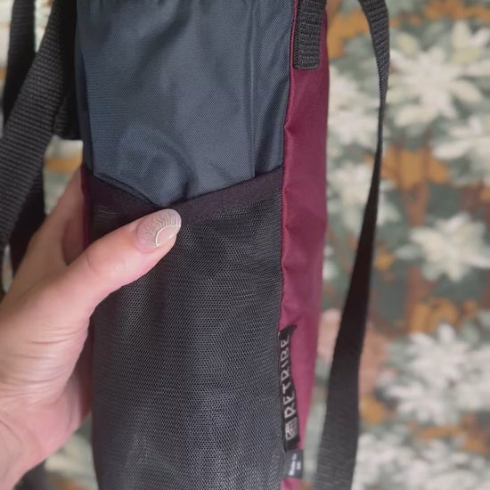 Constructed from 100% recycled materials, the Circular Bottle Holder features a drawcord bottle holder repurposed from a tents guy rope with adjustable strap, two mesh pockets formerly utilized as a tents mesh door, and a key chain and accessory loop.