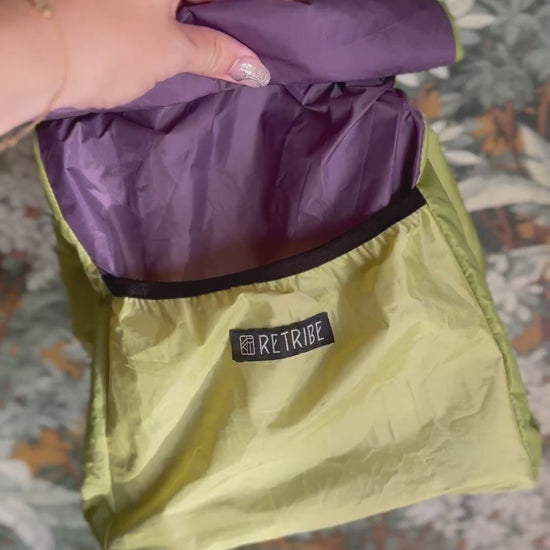 Made from salvaged tents, bright colours on the outside, and a silver lining inside to keep warm or cold inside. Roll top and a front pocket for the banana stash.